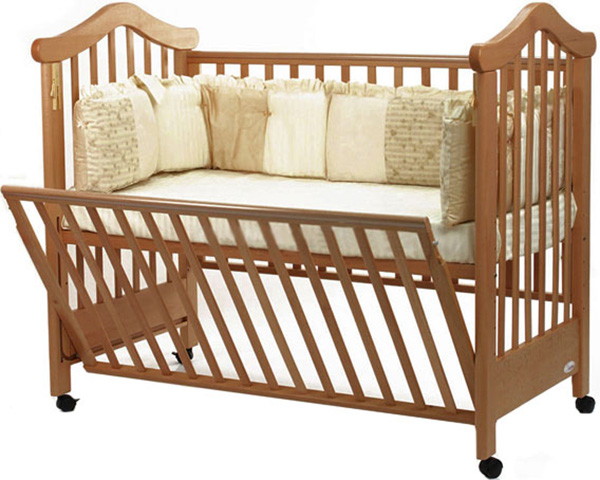 - Один из бортиков опускается на 20 см, тем самым, обеспечивая свободный доступ к малышу.