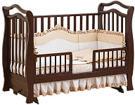 - Передняя панель съемная, может замещаться защитными бортиками, которые препятствуют возможности падения ребенка и при этом позволяют ему самостоятельно взбираться и выбираться из кроватки.