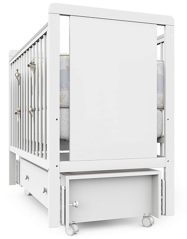 Маятниковый механизм обеспечивает плавное и тихое качание, а поворотные колёса со стопорами позволяют легко перемещать кроватку или фиксировать её в нужном положении. Функциональный ящик в основании — отличное решение для хранения постельных принадлежностей, игрушек и других детских вещей, что делает модель максимально практичной для покупателей.