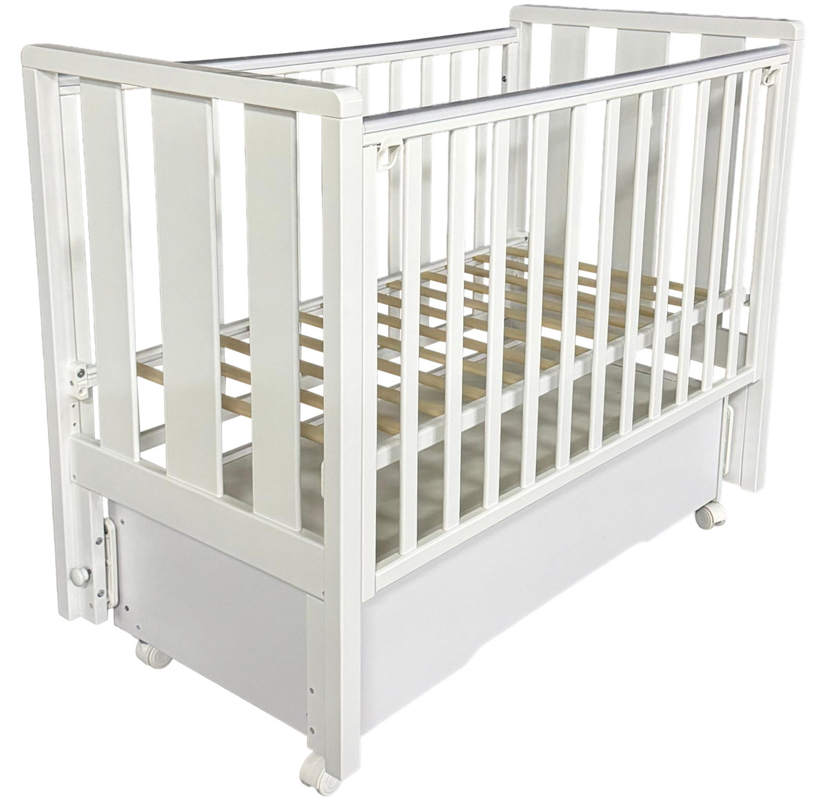 Реечное ложе с двумя уровнями высоты растёт вместе с ребёнком, обеспечивая комфорт и безопасность на каждом этапе развития. Съемная передняя стенка с двумя положениями позволяет легко укладывать и доставать малыша, бережно охраняя его сон.