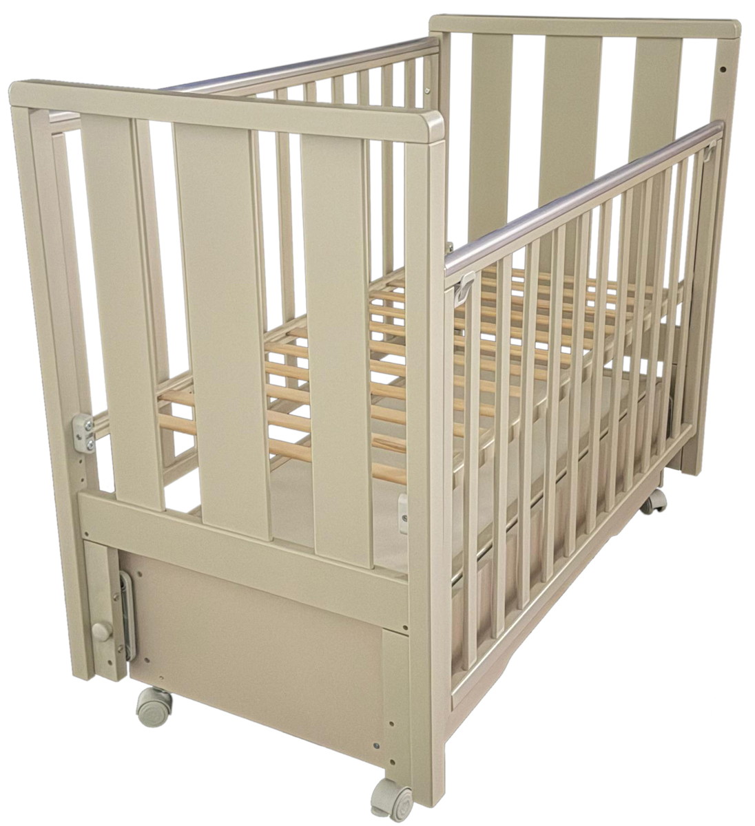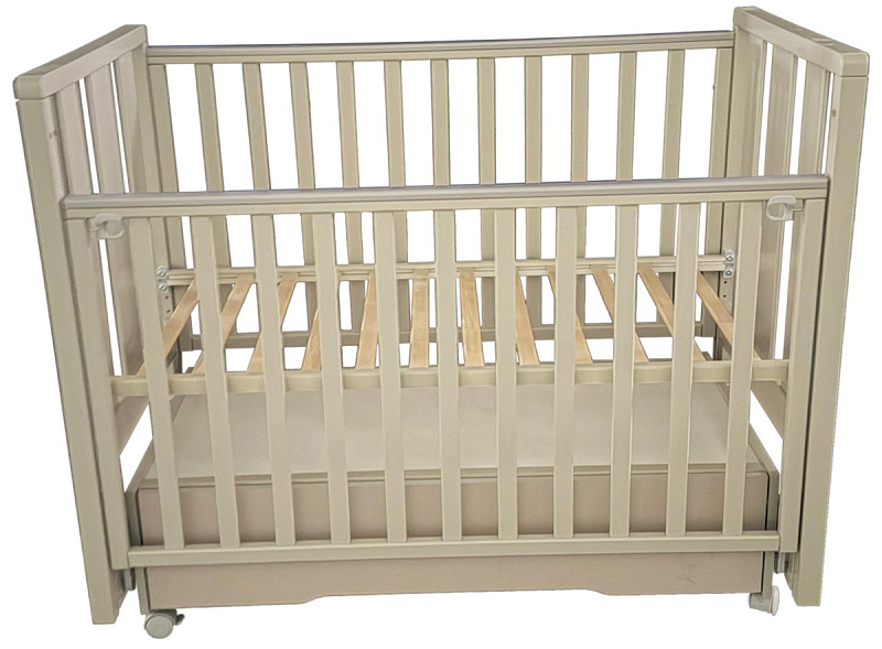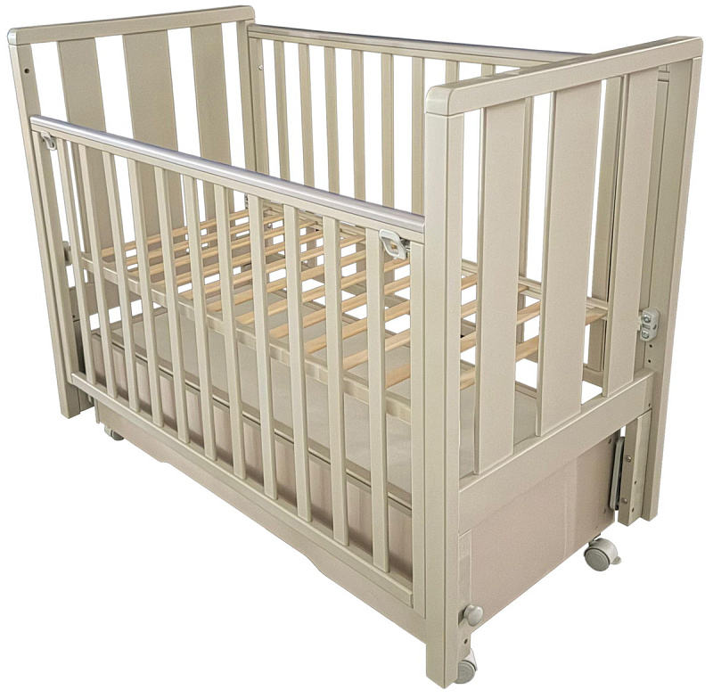 Реечное ложе с двумя уровнями высоты растёт вместе с ребёнком, обеспечивая комфорт и безопасность на каждом этапе развития. Съемная передняя стенка с двумя положениями позволяет легко укладывать и доставать малыша, бережно охраняя его сон.