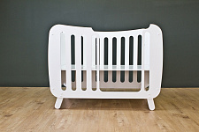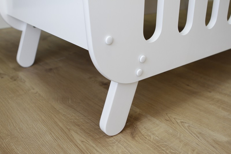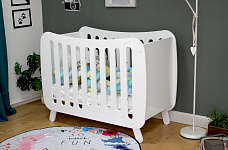 Детская кроватка с эмалевой отделкой. Спинки, ограждения и ложе кровати изготовлены из ламинированной МДФ. Для отделки кровати применяются морилки на водной основе, глянцевые ПУ лаки и эмали.