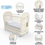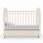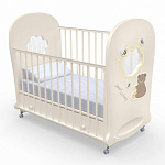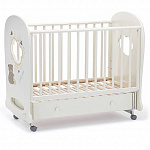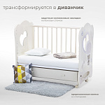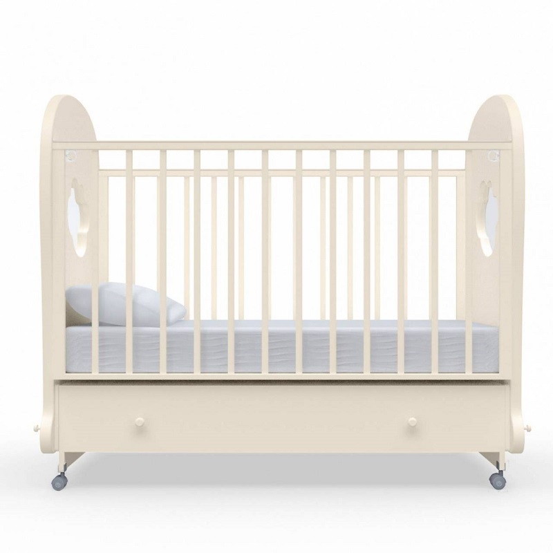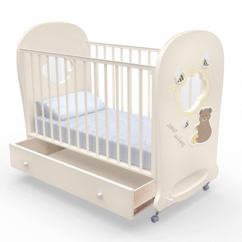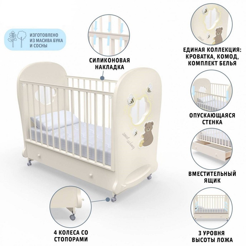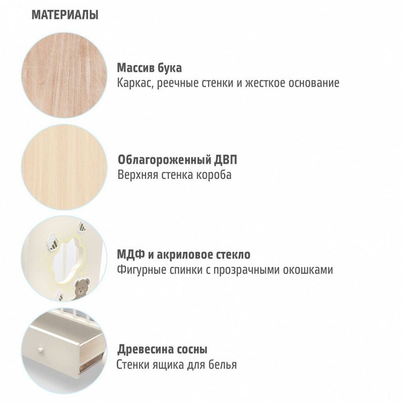 Кроватка рассчитана на малышей с рождения. При изготовлении использованы безопасные и экологически чистые материалы. Каркас, реечные стенки и жесткое основание выполнены из массива бука. Фигурные спинки с прозрачными окошками — из МДФ и акрилового стекла. Стенки ящика для белья изготовлены из древесины сосны, для верхней стенки короба используется облагороженный ДВП. Качество фурнитуры и покрытия соответствует европейскому уровню.