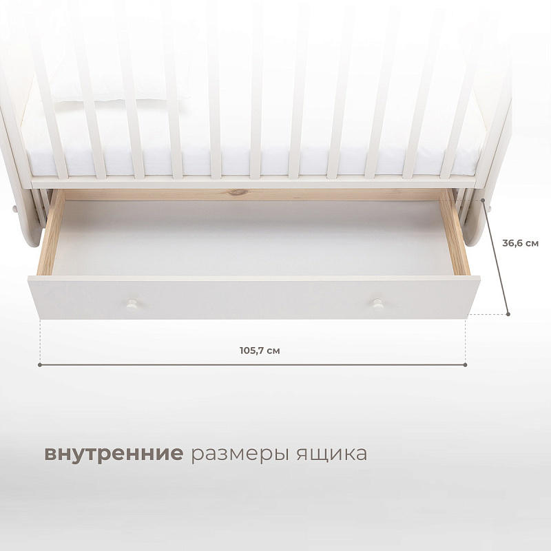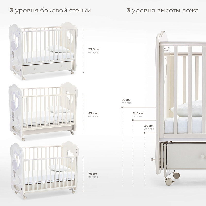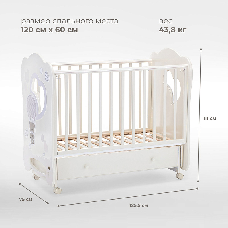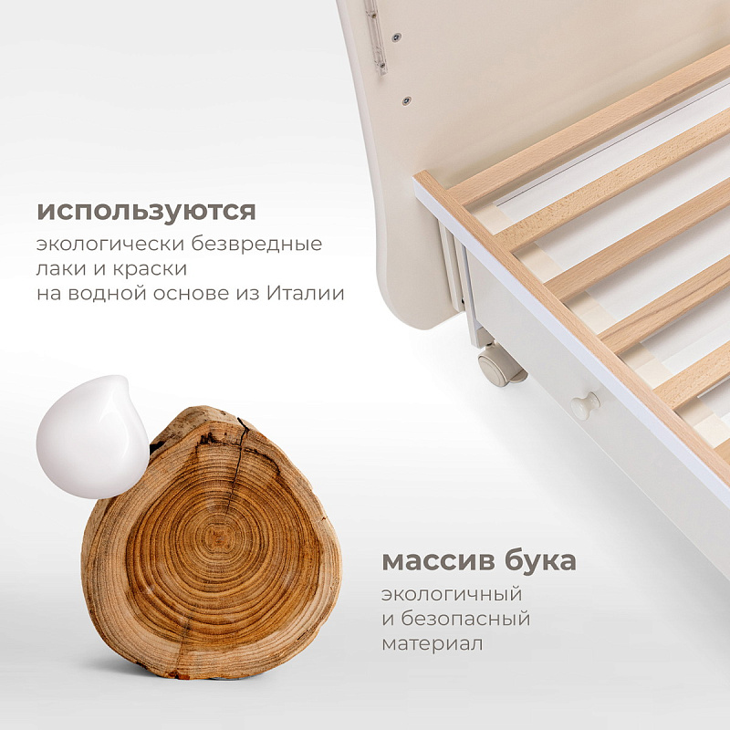 Кроватка рассчитана на малышей с рождения. При изготовлении использованы безопасные и экологически чистые материалы. Каркас, реечные стенки и жесткое основание выполнены из массива бука. Фигурные спинки с прозрачными окошками — из МДФ и акрилового стекла. Стенки ящика для белья изготовлены из древесины сосны, для верхней стенки короба используется облагороженный ДВП. Качество фурнитуры и покрытия соответствует европейскому уровню.