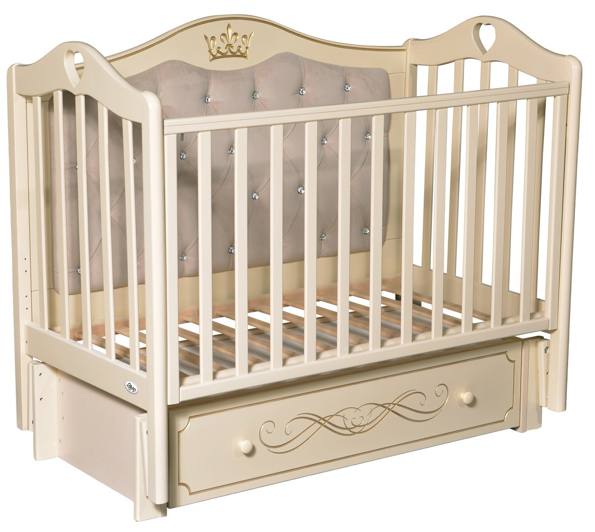 Кроватка DOMENICA ELEGANCE PREMIUM c мягкой задней спинкой, украшенной декоративной резьбой "Корона", укомплектована универсальным маятником, что позволит Вам собрать кроватку с функцией продольного либо поперечного качания в зависимости от того, как это требуется. Маятниковый механизм при необходимости фиксируется. Также кроватку можно использовать без маятника: либо как качалку, либо поставить на ножки. Передняя стенка опускается и имеет два положения по высоте для комфортного доступа к новорожденному малышу. При необходимости передняя стенка полностью снимается, ложе опускается в самое нижнее положение и кроватка превращается в диванчик.