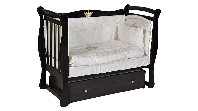 Кроватка выполнена в элегантном современном дизайне, который дополняет аппликация в виде Короны на задней стенке. Изогнутые ламели на боковых спинках придают кроватке свой неповторимый стиль и утонченность. Универсальный маятник позволит собрать кроватку с функцией продольного или поперечного качания. Передняя стенка опускается с помощью подпружиненных курков. Также ее можно снять и кроватка превратится в диванчик.