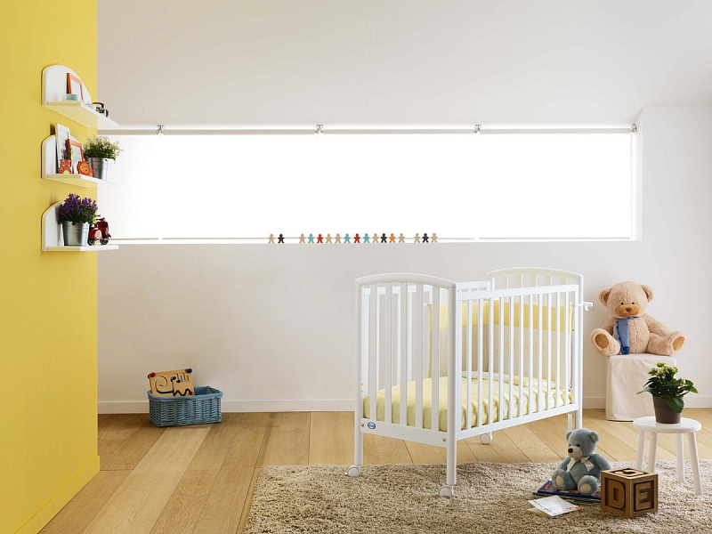 Особого внимания заслуживает запатентованный механизм опускания боковин. Этот инновационный механизм позволяет легко и бесшумно опускать и поднимать обе боковины одной рукой. Конструкция гарантирует, что ребенок не сможет самостоятельно опускать боковины, обеспечивая тем самым максимальную безопасность. Подматрасник представляет собой ортопедическую сетку из неокрашенного бука, устанавливаемую в двух положениях по высоте, что позволяет адаптировать кроватку к росту ребенка и удобству родителей.