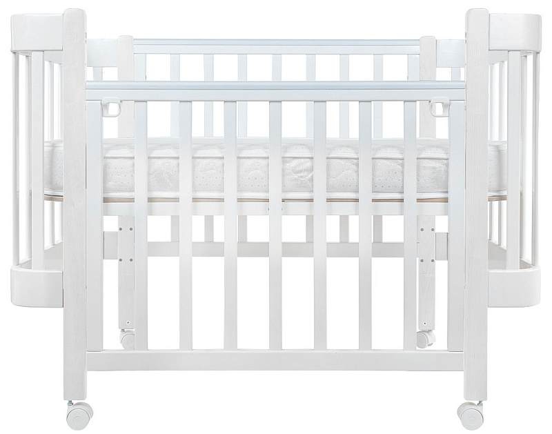 Передняя авто-стенка с возможностью полного снятия за считаные секунды, для удобного доступа к младенцу. Благодаря съемной авто-стенке, можно приставлять к родительской кровати. Фастексы с ремешками, можно кроватку сцепить с родительской кроватью