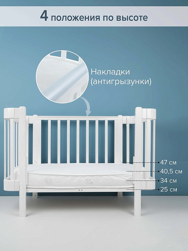 Ложе кроватки имеет 4 положения по высоте: от пола (25 см±1 см; 34 см±1-2 см; 40,5 см±1-2 см; 47 см±1-2 см).