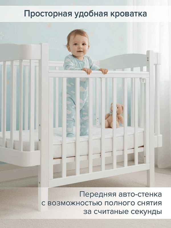 Передняя авто-стенка с возможностью полного снятия за считаные секунды, для удобного доступа к младенцу.