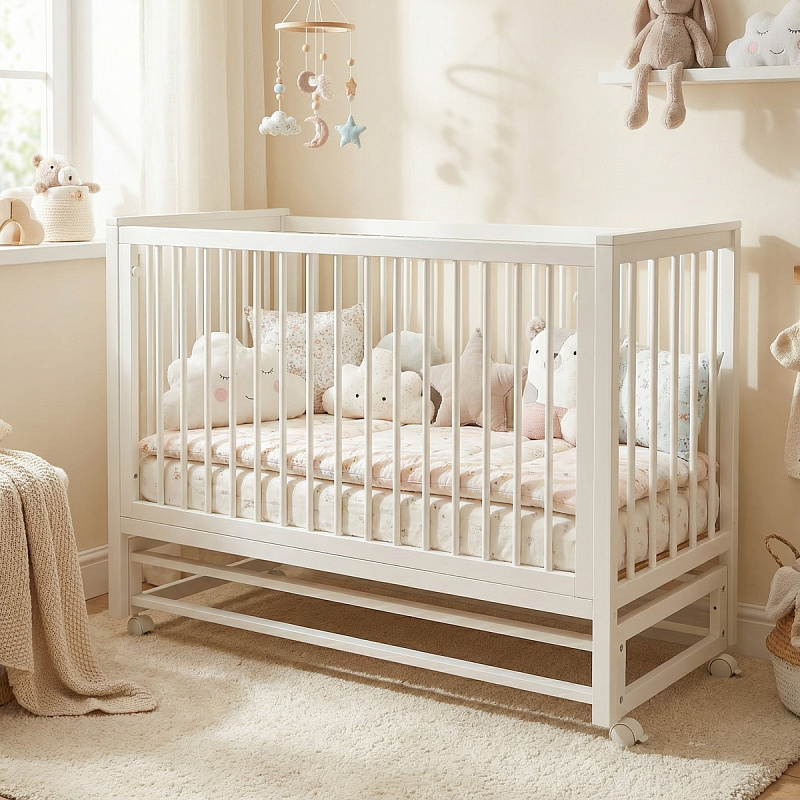 Устойчивость и мобильность: 4 колеса со стопорами обеспечивают легкое перемещение и надёжную фиксацию на любом покрытии. Кроватка на колесиках со стопором.