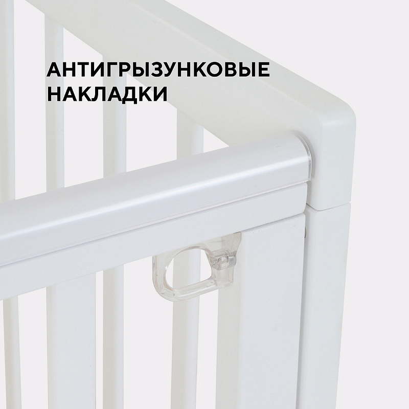 верхние планки дополнены силиконовыми накладками, чтобы ребенок не повредил нежные десны и поверхность кроватки;