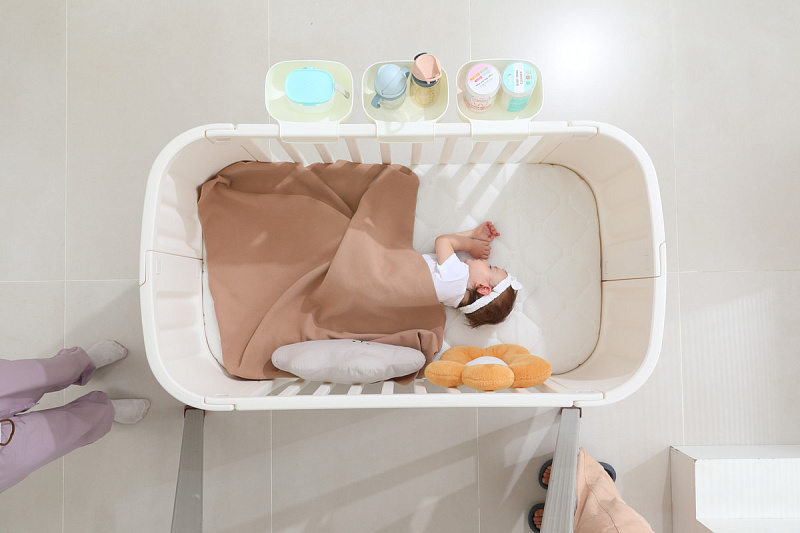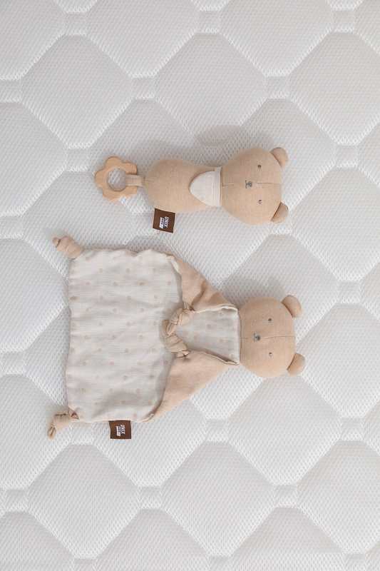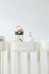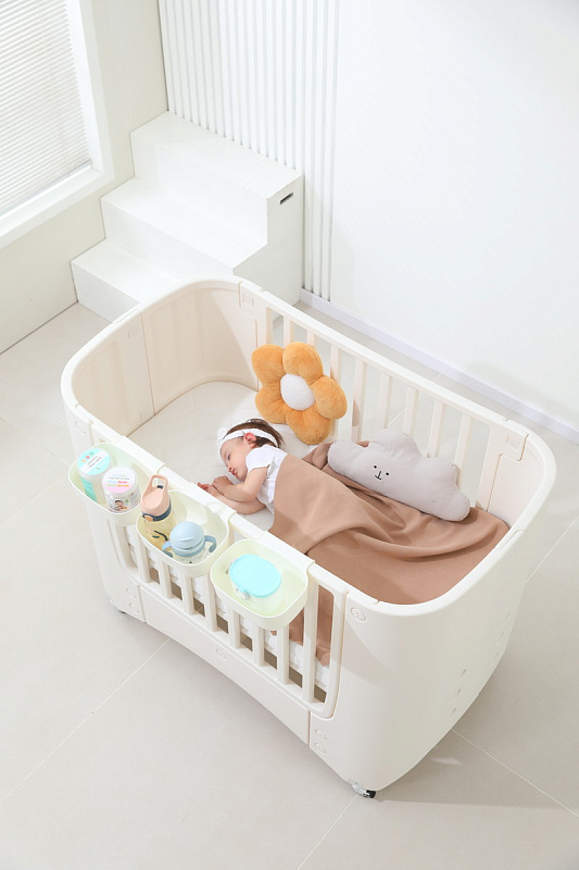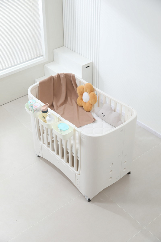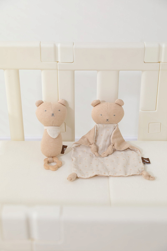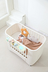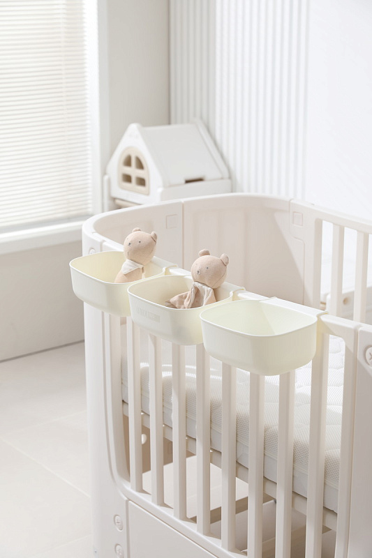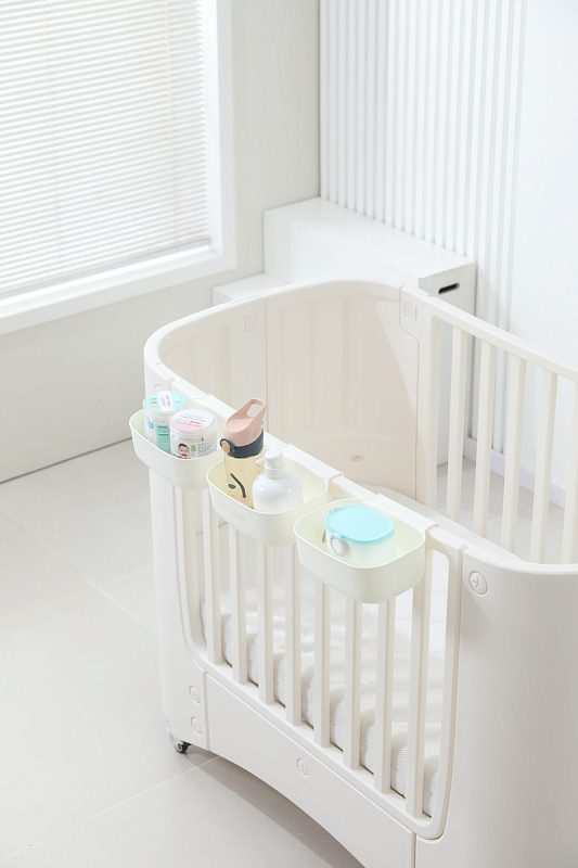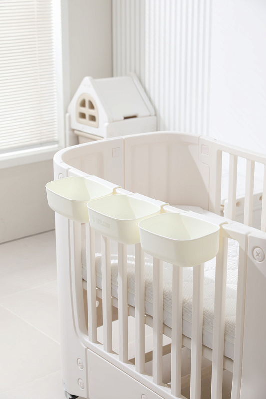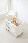 Дополнительно в комплекте идёт органайзер с тремя отделениями размером 21 х 15 х 9 см, позволяющих хранить необходимые предметы и поддерживать порядок вокруг спального места ребенка и две игрушки для новорожденных.