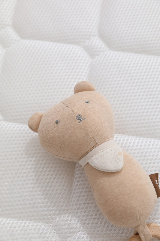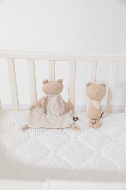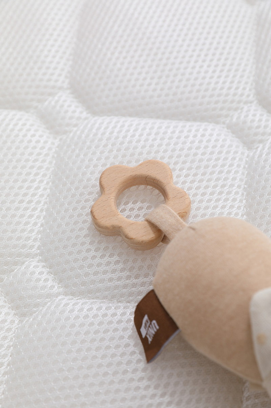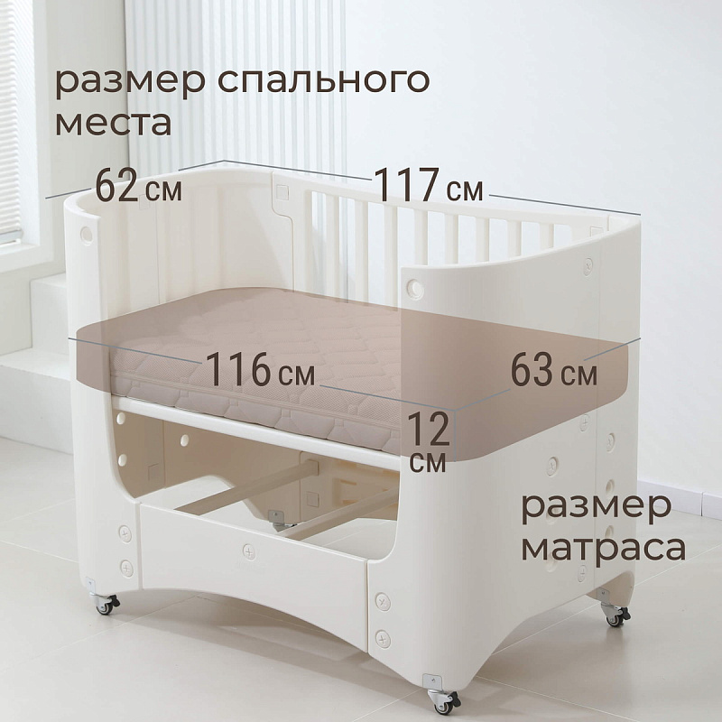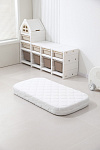 В комплекте с кроватью на колесиках идет двусторонний матрас средней жесткости, обеспечивающий правильную поддержку позвоночника малыша. Натуральный состав наполнителей (латекс и кокосовая койра толщиной 12 мм каждый слой) гарантирует экологичность и гипоаллергенность. Съемный чехол выполнен из хлопка.