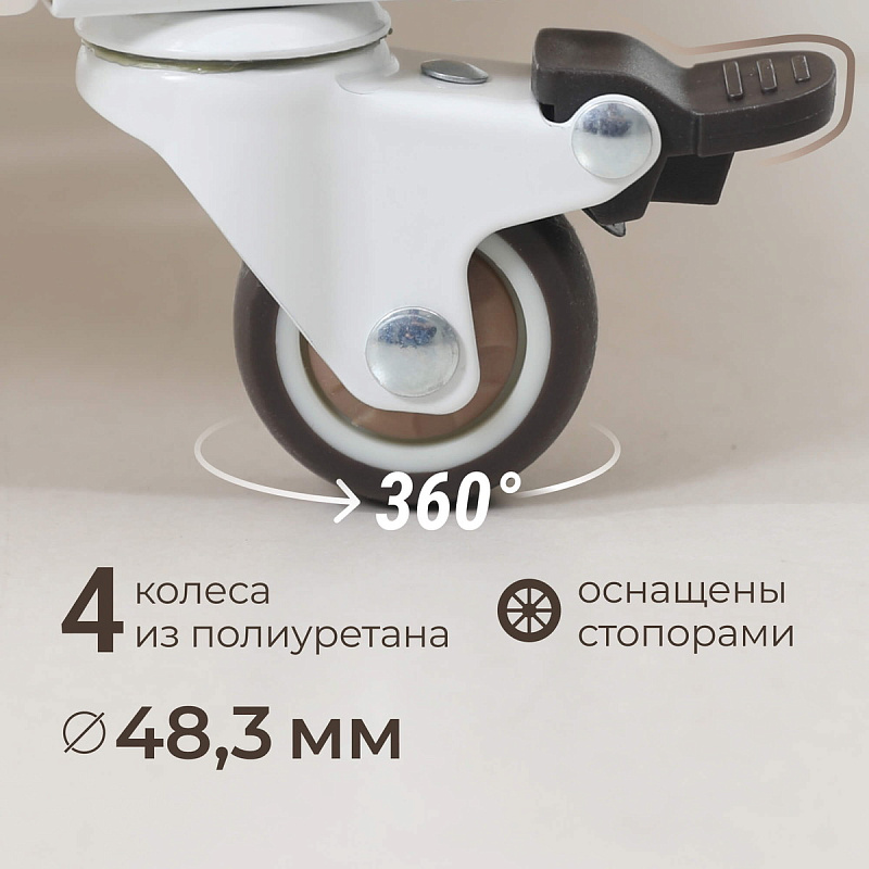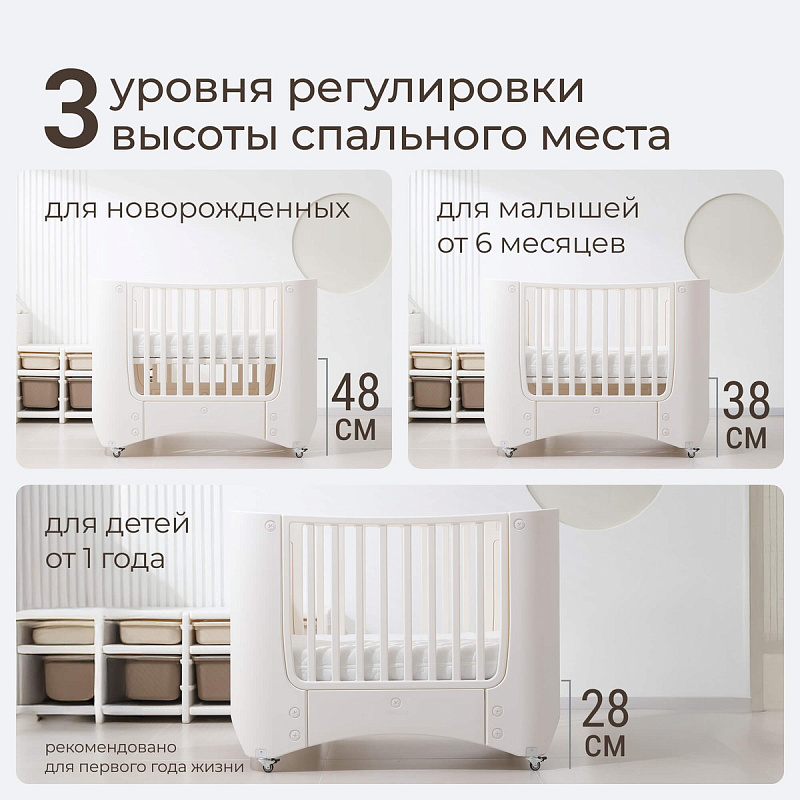 Регулировка высоты спального места детской кровати с бортиком осуществляется на трех уровнях (48 см, 38 см и 28 см), позволяя адаптироваться под возраст и потребности ребенка, с возможностью трансформации в диванчик. Оснащение четырьмя колесиками со стопорными механизмами упрощает перемещение по комнате, сохраняя устойчивость и мобильность одновременно. Колеса свободно вращаются на 360 градусов, облегчая маневры и размещение мебели в удобном положении.
