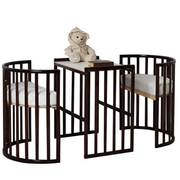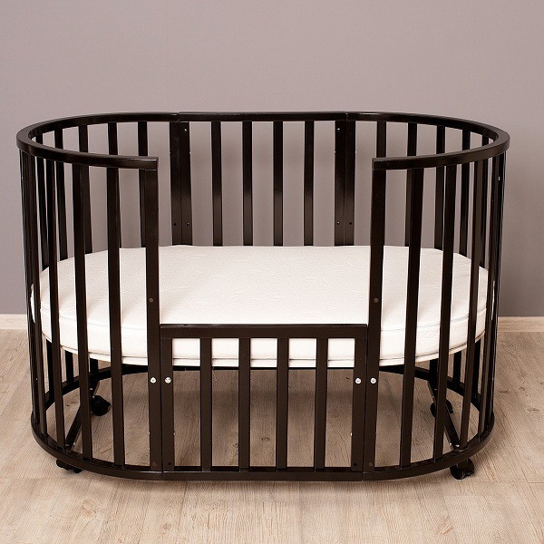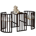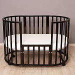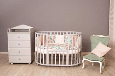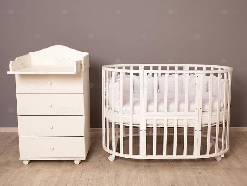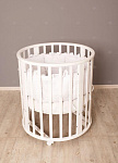 Варианты трансформации: круглая кровать 75х75см , пеленальный стол, овальная кровать 125х75 см, манеж, прикроватная кроватка, диванчик, игровой столик, стол и стульчики