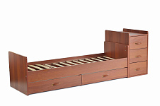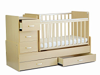 Комод можно установить как с правой, так и с левой стороны. Два нижних выдвижных ящика на направляющих. Такая конструкция удобна тем, что не взаимодействует с покрытием пола, а перегородка между ящиками придает кроватке дополнительную жёсткость.