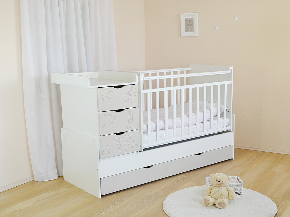 Фасады из МДФ, облицовыванные плёнкой ПВХ, с забавной фрезеровкой в виде жирафа. Пеленальный стол с ограждениями стал гораздо удобнее, за счёт увеличения размера столешницы.