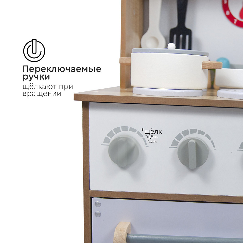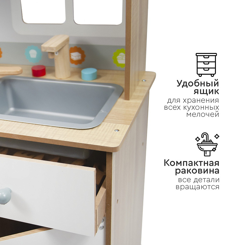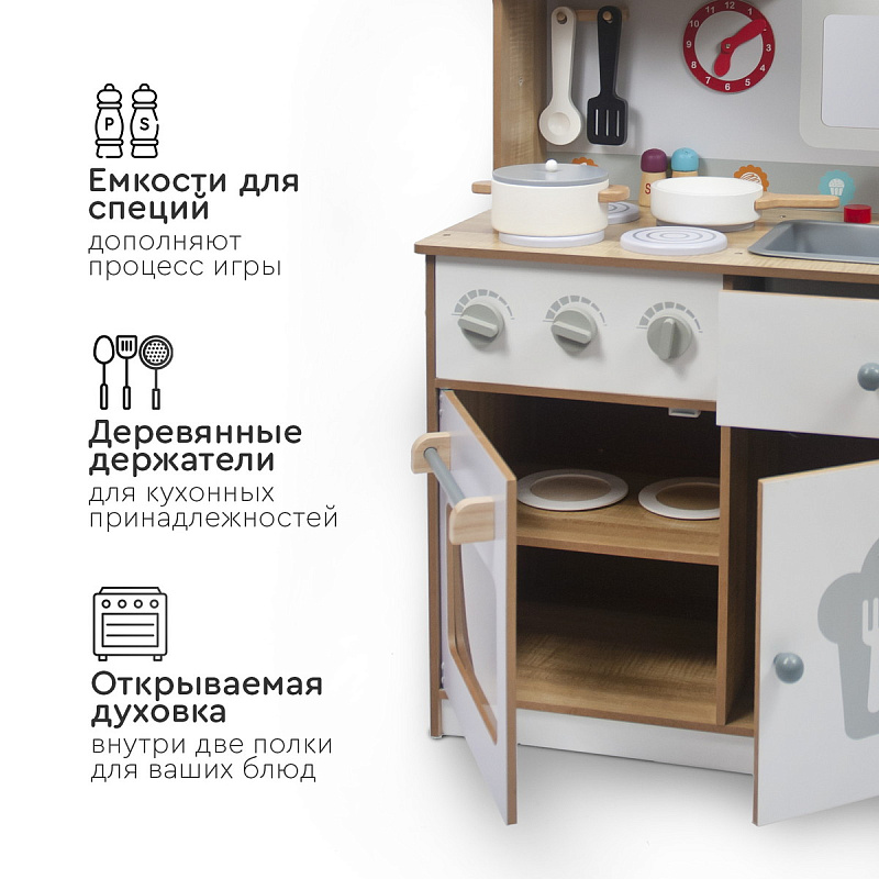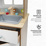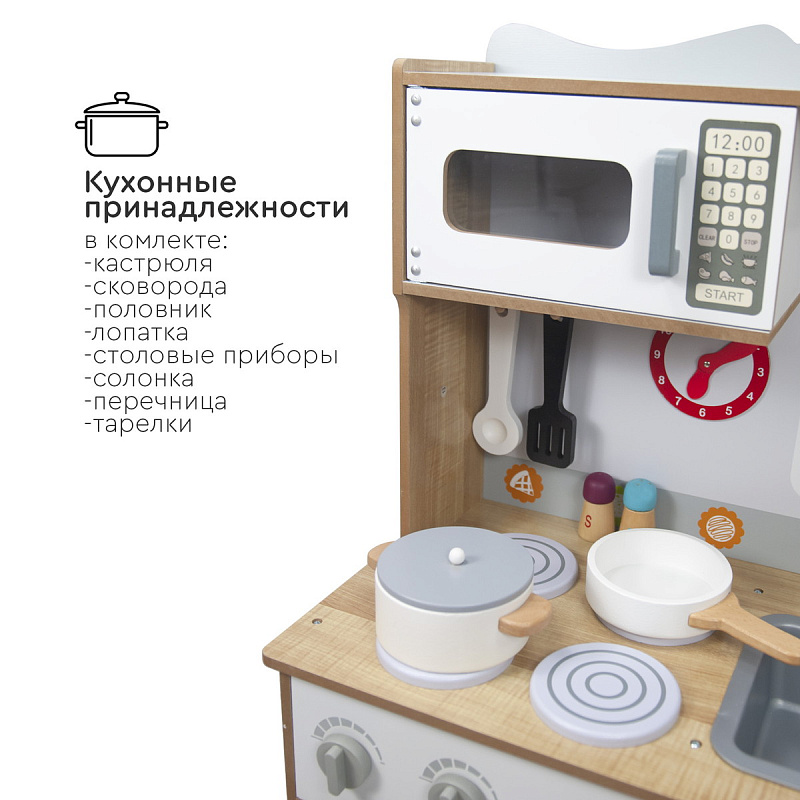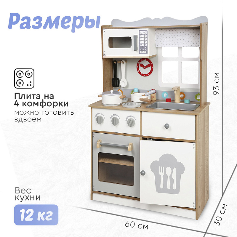 Кухня изготовлена из дерева — экологически чистого материала. Собирается легко с помощью поэтапной подробной инструкции (понадобится только крестовая отвертка). Все углы кухни закруглены для безопасности детей во время игры.
