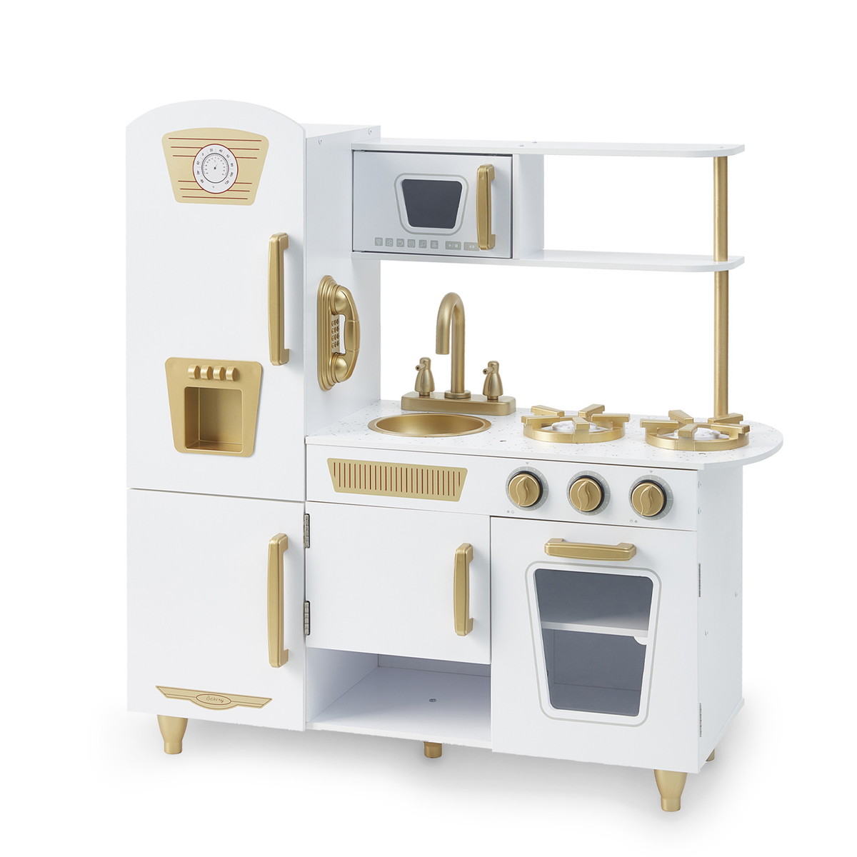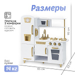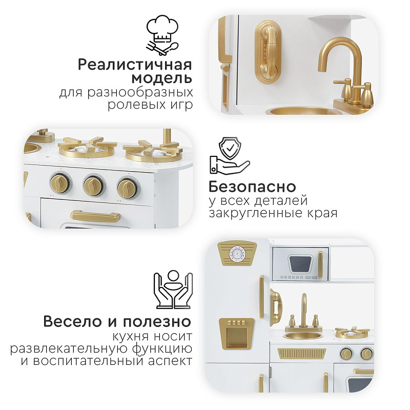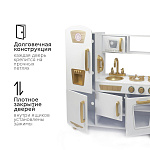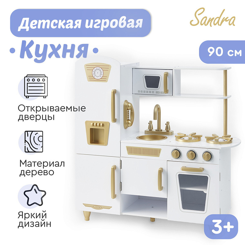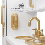 Детская игровая кухня Tomix Sandra непременно приведёт в восторг юного кулинара! Светлая кухня с элементами, стилизованными под золото, станет украшением детской комнаты! В ней есть все для реалистичной игры: духовой шкаф с двумя полками для разных блюд и щелкающими переключателями, варочная поверхность с двумя конфорками, компактная раковина с вращающимися элементами, встроенный холодильник, шкафчик для хранения посуды и даже микроволновая печь!