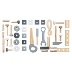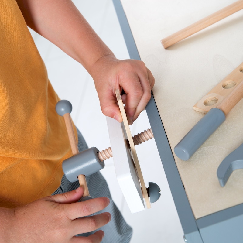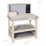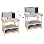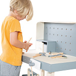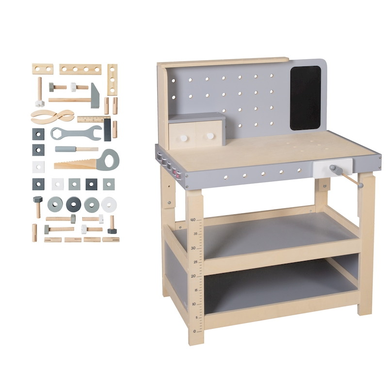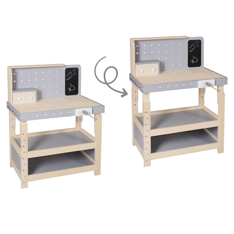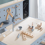 С этой игрушкой-конструктором верстак превращается в небольшую мастерскую, в которой достаточно места для создания множества замечательных работ. Помимо тисков, деревянный верстак имеет панель для эскизов, распечатанную рулетку, два выдвижных ящика и боковые петли для инструментов. Все виды инструментов или игрушек можно хранить на двух больших полках под рабочей поверхностью.
