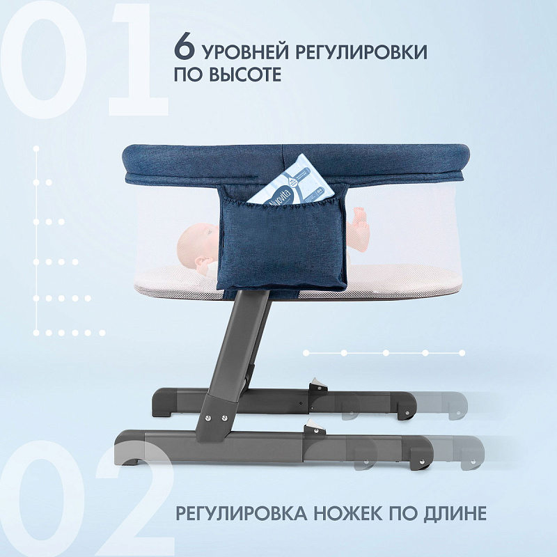 Кроватка представляет собой люльку, установленную на металлические ножки, и предназначена для малышей с первых дней жизни и до полугодовалого возраста (максимальный вес ребенка — 9 кг). Удобная конструкция позволяет регулировать уровень спального места в 6-ти положениях: от 29 см до 44 см. Регулировка выполняется при помощи нажатия фиксаторов, находящихся на ножках, и позволяет подобрать оптимальный вариант высоты с учетом расположения родительской постели.