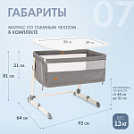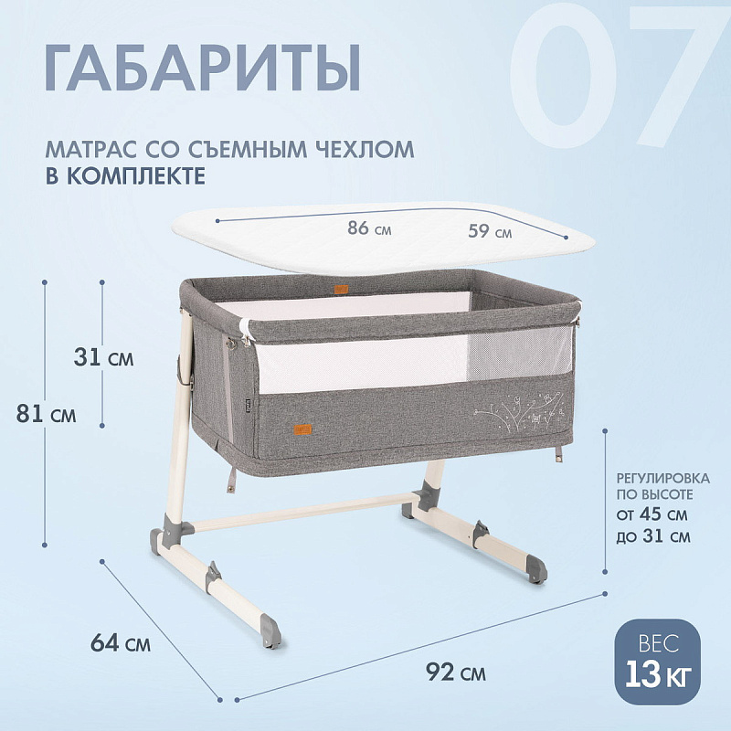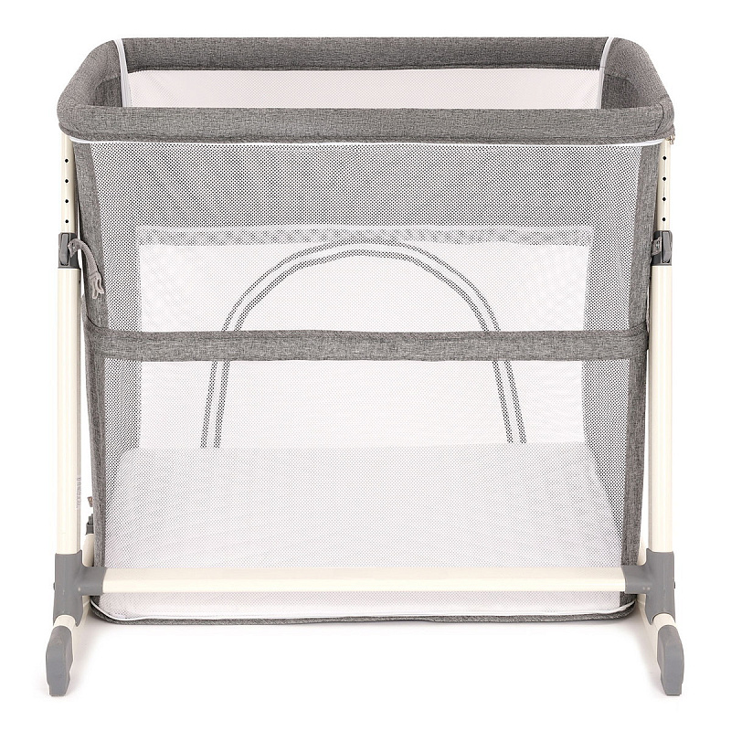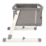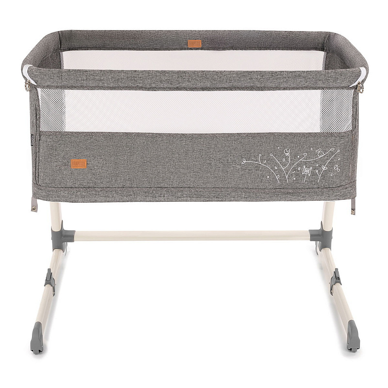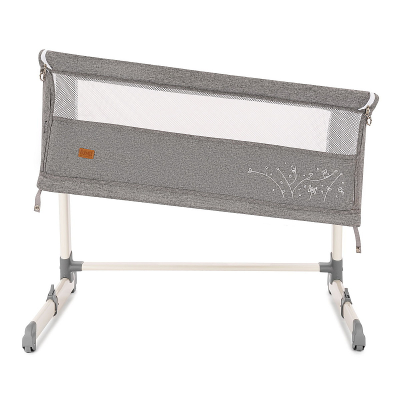 Люлька имеет откидной бортик, фиксируемый на «молнии», благодаря чему изделие удобно для использования в качестве приставной кровати. Достаточно отстегнуть бортик и закрепить при помощи ремней детскую кроватку к каркасу родительской постели, соблюдая одинаковую высоту, и конструкция готова для совместного сна мамы и малыша. Предусмотрено 7 уровней расположения спального места (от 31 см до 45 см), которые выбираются при помощи удобных рычагов, находящихся на стойках.