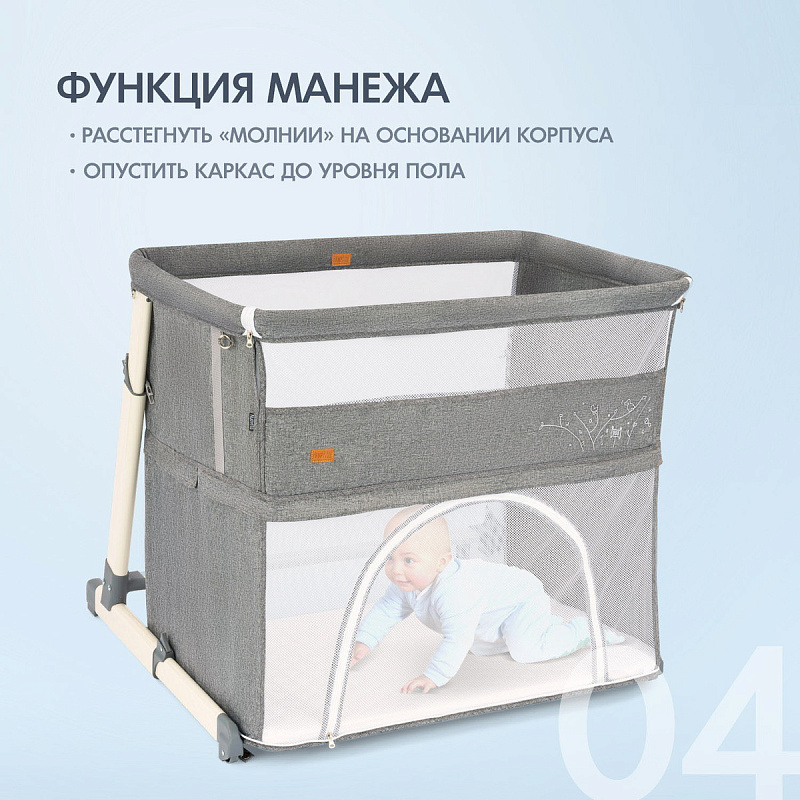 Отличительной особенностью данной модели является возможность трансформации в манеж. Для этого необходимо расстегнуть «молнии» на основании корпуса, после чего опустить каркас до уровня пола. Матрасик, предлагаемый в комплекте, имеет съемный чехол, который можно стирать в ручном режиме.