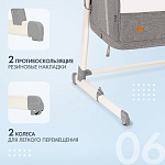 Для комфортного перемещения на опорных стойках кроватки предусмотрены 2 колесика. Устойчивое положение обеспечивают противоскользящие накладки на противоположных сторонах ножек. Присутствует возможность регулировки длины ножек, выполняемой буквально в одно нажатие.