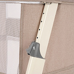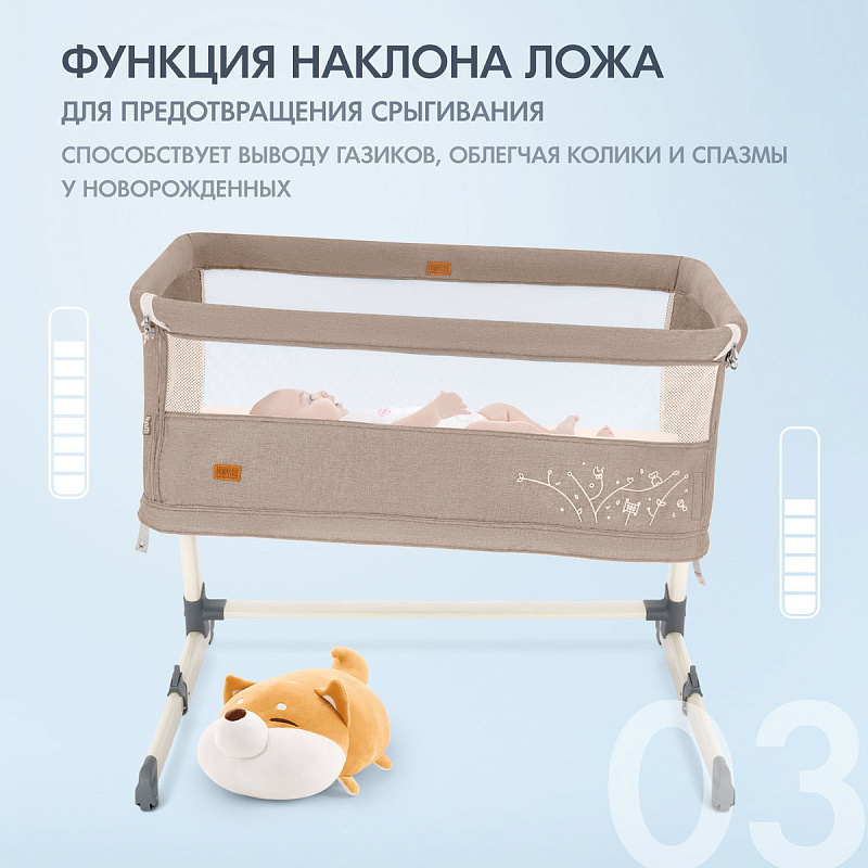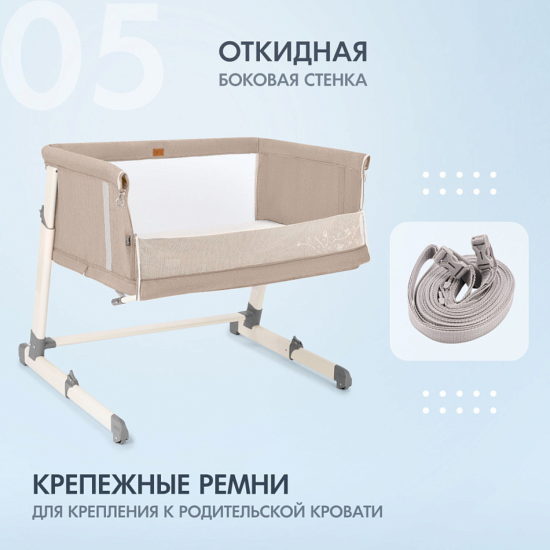 Люлька имеет откидной бортик, фиксируемый на «молнии», благодаря чему изделие удобно для использования в качестве приставной кровати. Достаточно отстегнуть бортик и закрепить при помощи ремней детскую кроватку к каркасу родительской постели, соблюдая одинаковую высоту, и конструкция готова для совместного сна мамы и малыша. Предусмотрено 7 уровней расположения спального места (от 31 см до 45 см), которые выбираются при помощи удобных рычагов, находящихся на стойках.