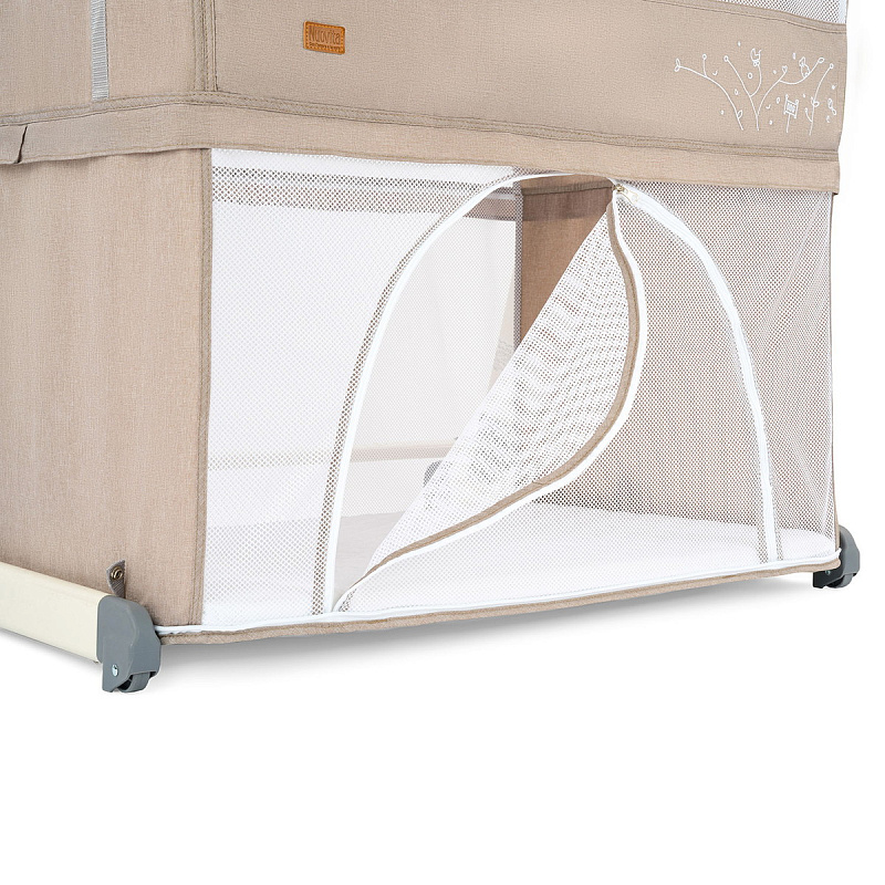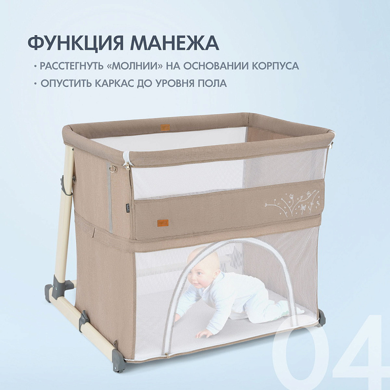 Отличительной особенностью данной модели является возможность трансформации в манеж. Для этого необходимо расстегнуть «молнии» на основании корпуса, после чего опустить каркас до уровня пола. Матрасик, предлагаемый в комплекте, имеет съемный чехол, который можно стирать в ручном режиме.