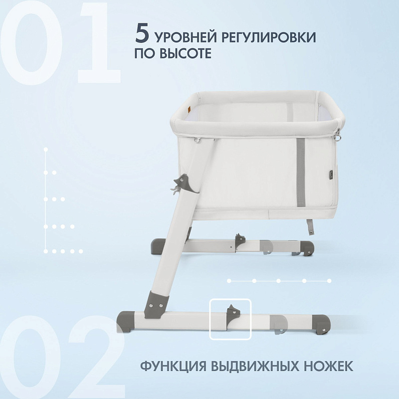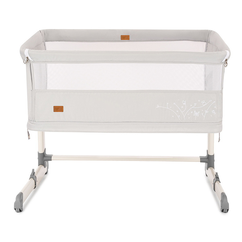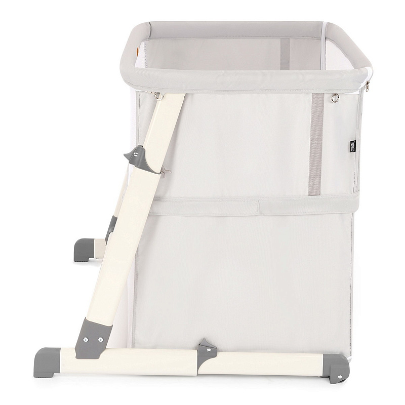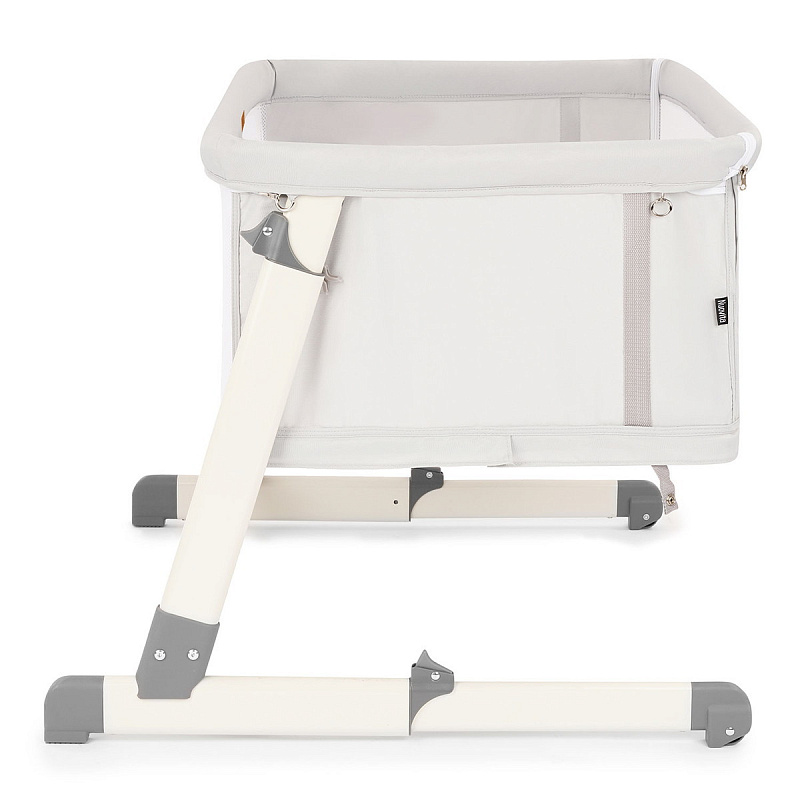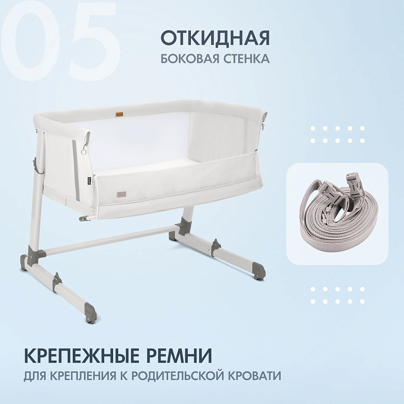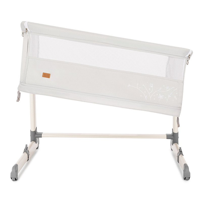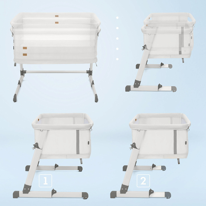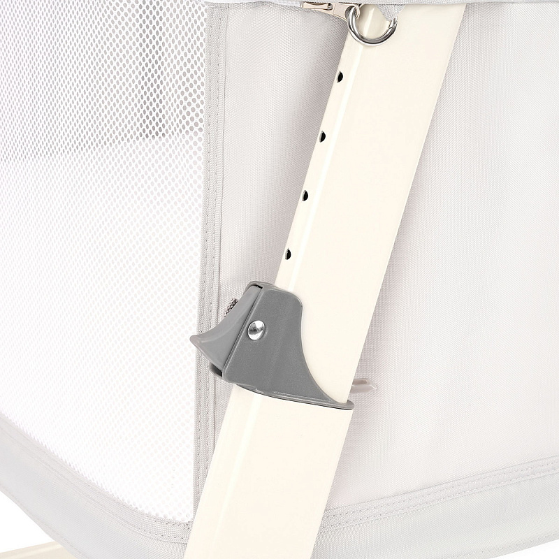 Люлька имеет откидной бортик, фиксируемый на «молнии», благодаря чему изделие удобно для использования в качестве приставной кровати. Достаточно отстегнуть бортик и закрепить при помощи ремней детскую кроватку к каркасу родительской постели, соблюдая одинаковую высоту, и конструкция готова для совместного сна мамы и малыша. Предусмотрено 7 уровней расположения спального места (от 31 см до 45 см), которые выбираются при помощи удобных рычагов, находящихся на стойках.