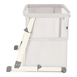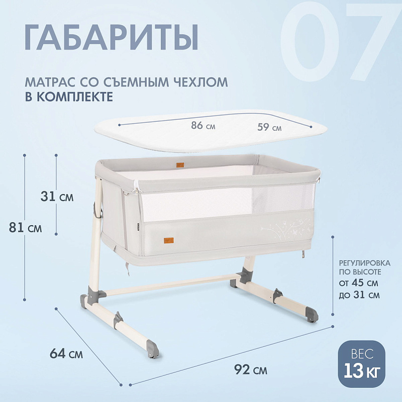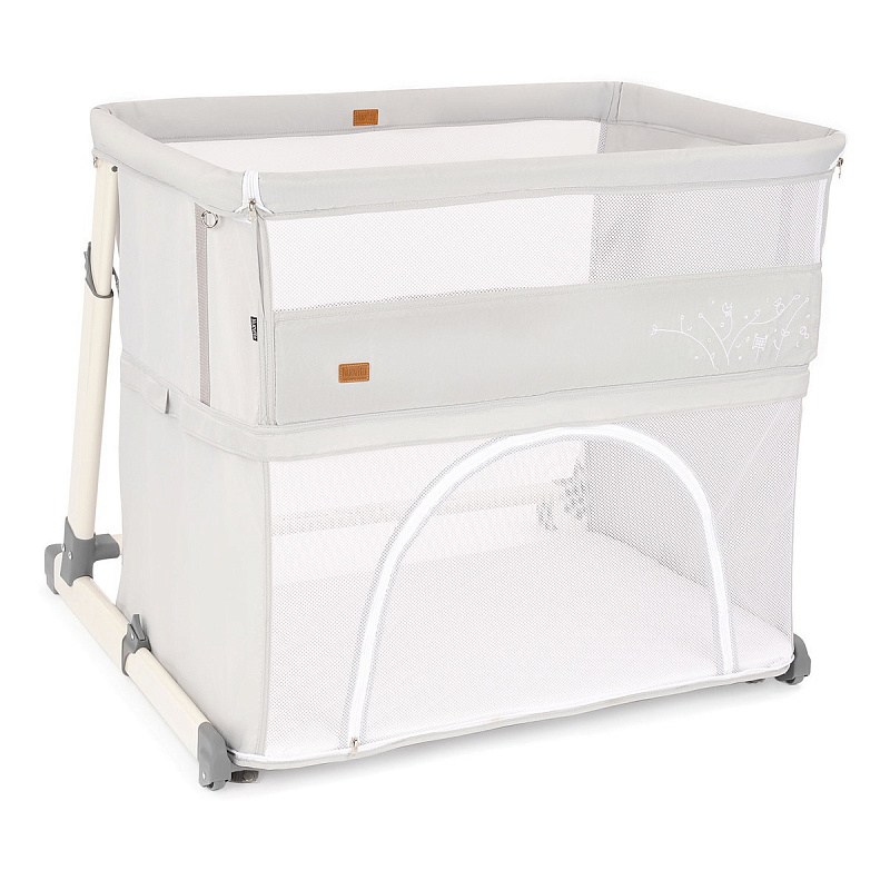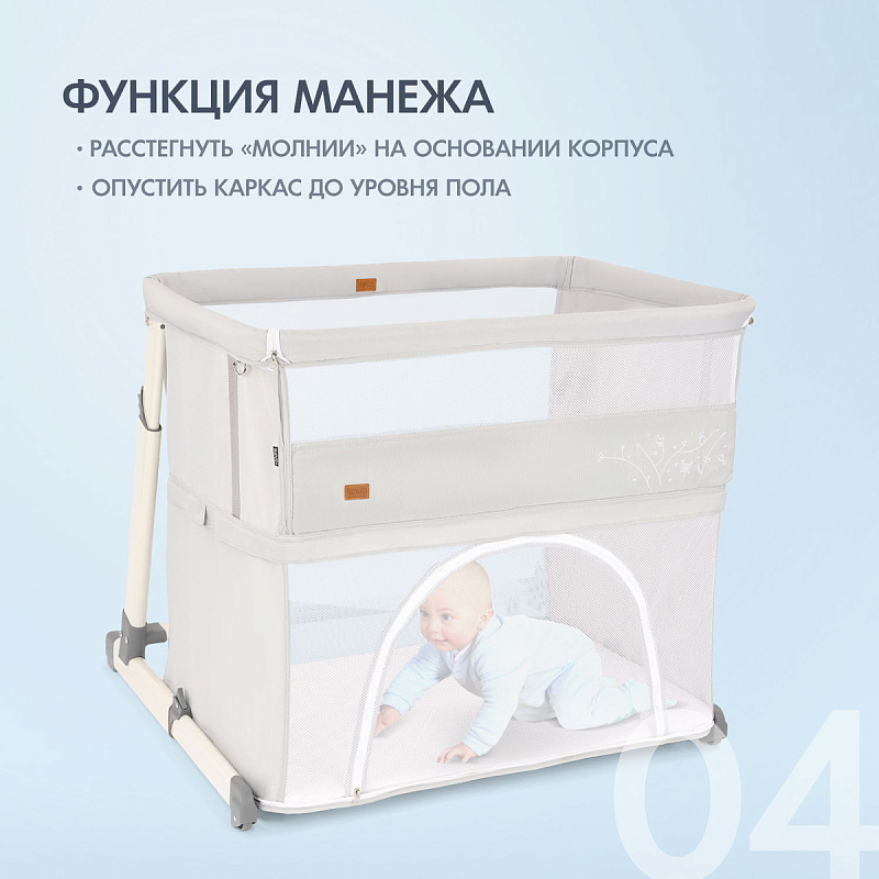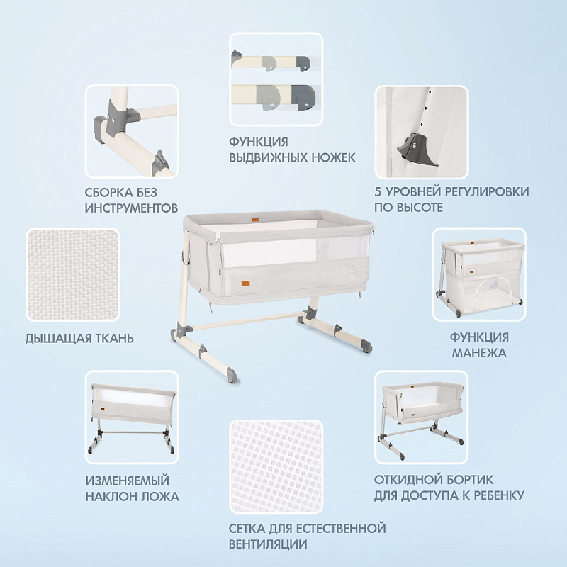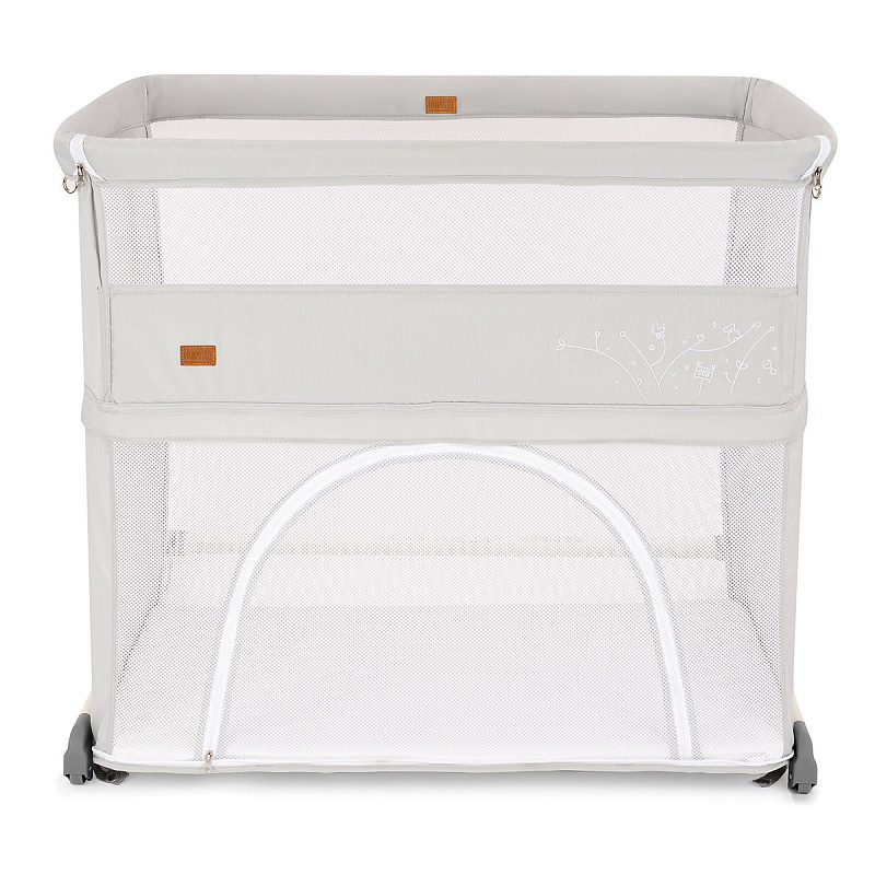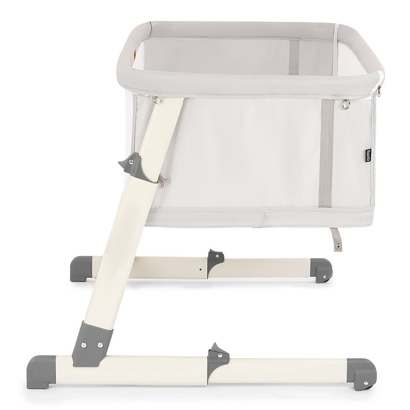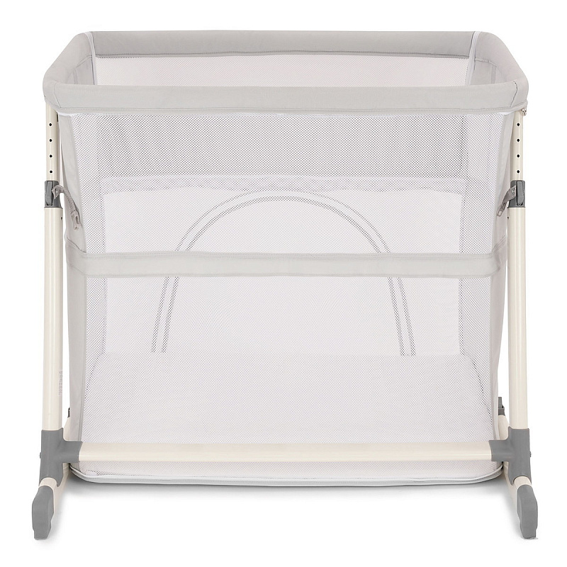 Люлька имеет откидной бортик, фиксируемый на «молнии», благодаря чему изделие удобно для использования в качестве приставной кровати. Достаточно отстегнуть бортик и закрепить при помощи ремней детскую кроватку к каркасу родительской постели, соблюдая одинаковую высоту, и конструкция готова для совместного сна мамы и малыша. Предусмотрено 7 уровней расположения спального места (от 31 см до 45 см), которые выбираются при помощи удобных рычагов, находящихся на стойках.
