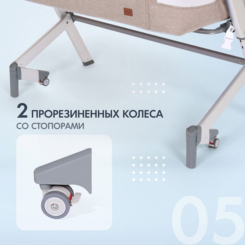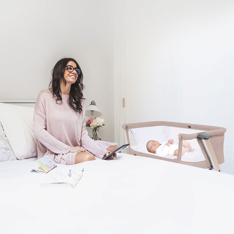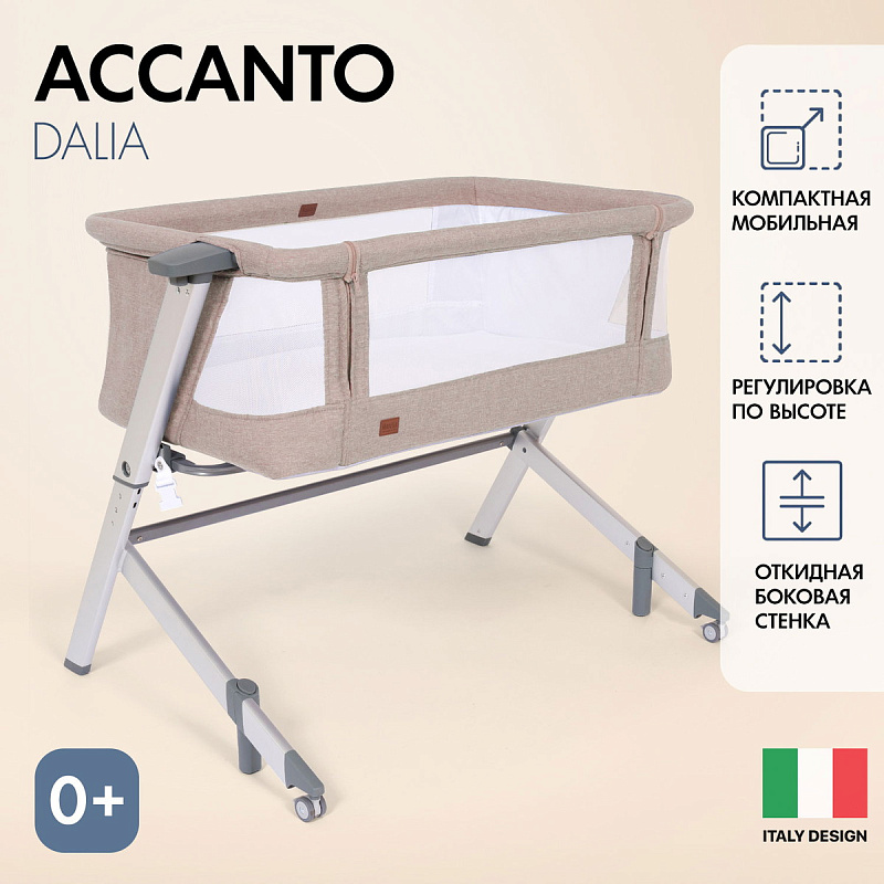 Здоровый сон новорожденного младенца — заветная мечта молодых родителей, исполнить которую поможет приставная колыбель Accanto Dalia. Размеры колыбели оптимальны для детей в первые шесть месяцев жизни и рассчитаны на то, чтобы обеспечить ребенку комфортное положение и одновременно чувство уюта и защищенности. Возможность изменять наклон ложа до 175° очень важна для полноценной вентиляции лёгких новорожденного и профилактики срыгиваний. Поскольку ничто не может компенсировать удалённость от мамы, предусмотрен режим совместного сна: можно снять боковую стенку и придвинуть колыбель к родительской кровати, зафиксировав её специальными ремнями. Для удобства использования предусмотрены пятиуровневая регулировка по высоте и колёса со стопорами. Колыбель легко разбирается и компактно складывается в практичный чехол, благодаря чему она незаменима в путешествиях.