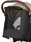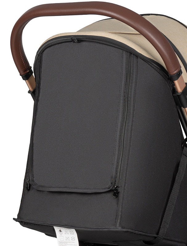 Передние колёса из полиуретана поглощают шум и вибрацию, а на каждом колесе есть тормоз. Коляска легко складывается одной рукой, а большой капюшон с дополнительной секцией на молнии позволяет увеличить его при необходимости. Безопасность во время движения обеспечивают тканевый разделитель для ножек и ремни.