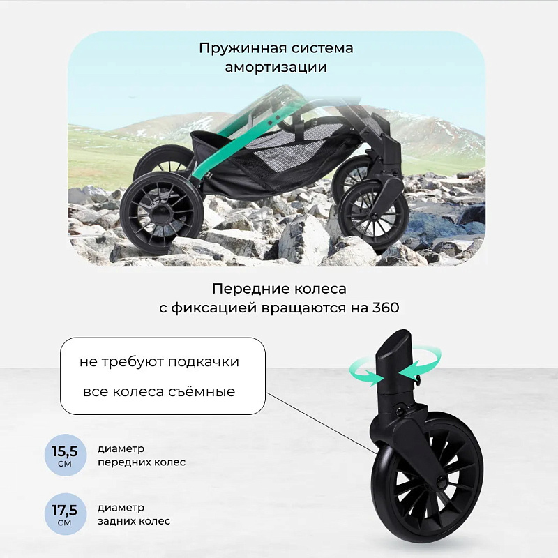Количество колёс, размеры колес4 колеса: передние 15,5 см, задние 17,5 см