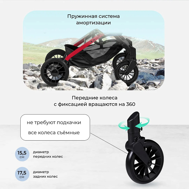 Количество колёс, размеры колес4 колеса: передние 15,5 см, задние 17,5 см