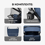 В комплекте с коляской идёт подстаканник, вместительная и функциональная сумка для мамы, москитная сетка и утеплённая накидка для ног. Таким образом, родителям не придется дополнительно приобретать эти аксессуары, все уже входит в комплект.