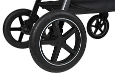 2. Большие прорезиненные колеса являются износостойкими и легкими, не боятся проколов. Они не требуют подкачки и обеспечивают прекрасную маневренность на любом покрытии дороги. Диаметр передних колес составляет 18 см, а задних - 25 см. Передние колеса поворотные на 360° и имеют функцию фиксации направления движения. Кроме того, все колеса съемные. Для дополнительного комфорта и маневренности коляска оснащена амортизацией всех 4 колес.