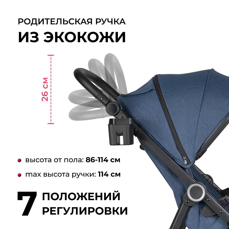 6. Родительская ручка регулируется по высоте в 7 положениях с максимальной высотой 114 см. Она выполнена из практичной экокожи.