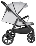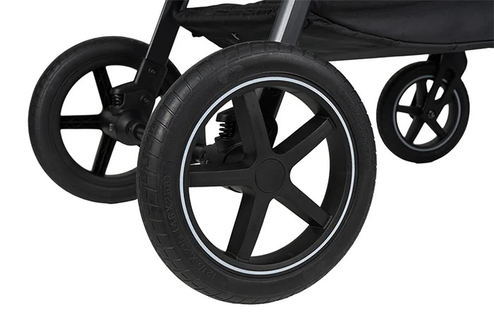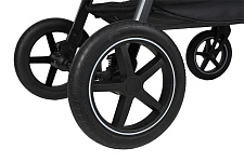 2. Большие прорезиненные колеса являются износостойкими и легкими, не боятся проколов. Они не требуют подкачки и обеспечивают прекрасную маневренность на любом покрытии дороги. Диаметр передних колес составляет 18 см, а задних - 25 см. Передние колеса поворотные на 360° и имеют функцию фиксации направления движения. Кроме того, все колеса съемные. Для дополнительного комфорта и маневренности коляска оснащена амортизацией всех 4 колес.