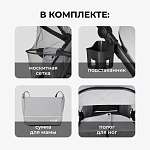 В комплекте с коляской идёт подстаканник, вместительная и функциональная сумка для мамы, москитная сетка и утеплённая накидка для ног. Таким образом, родителям не придется дополнительно приобретать эти аксессуары, все уже входит в комплект.