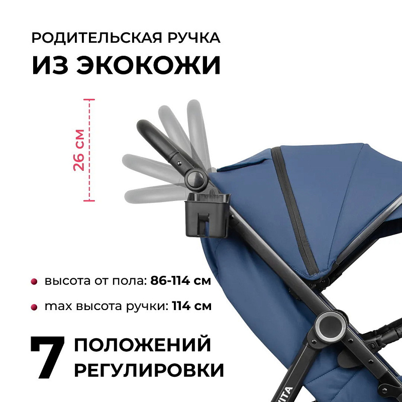 6. Родительская ручка регулируется по высоте в 7 положениях с максимальной высотой 114 см. Она выполнена из практичной экокожи.