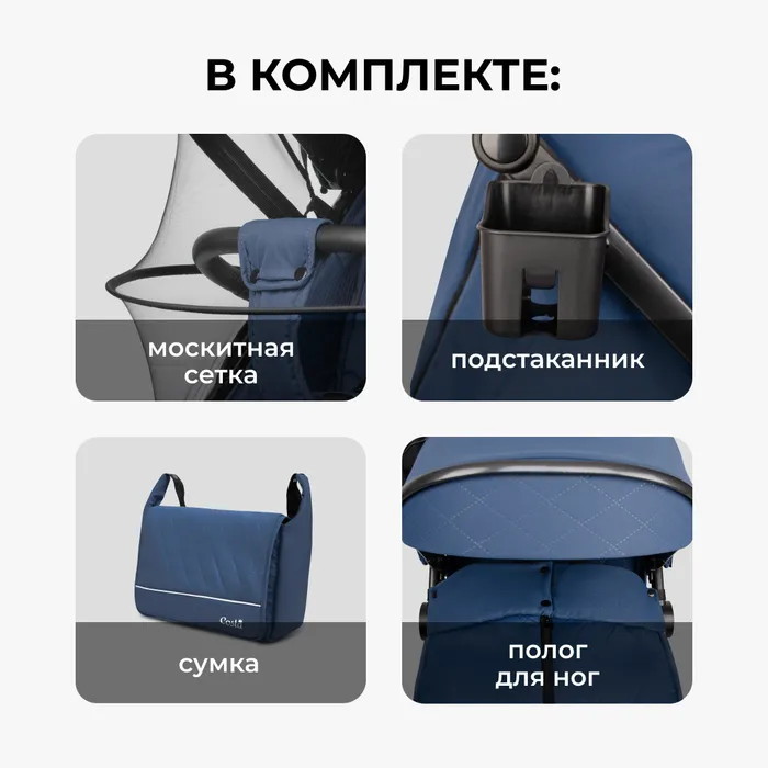 В комплекте с коляской идёт подстаканник, вместительная и функциональная сумка для мамы, москитная сетка и утеплённая накидка для ног. Таким образом, родителям не придется дополнительно приобретать эти аксессуары, все уже входит в комплект.
