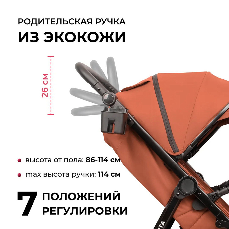 6. Родительская ручка регулируется по высоте в 7 положениях с максимальной высотой 114 см. Она выполнена из практичной экокожи.