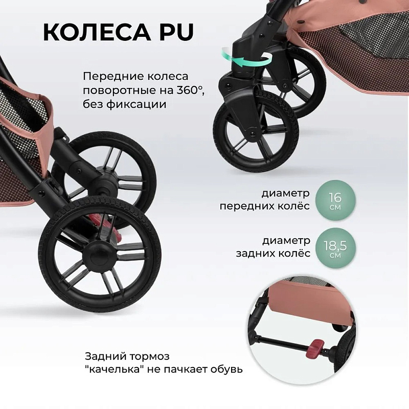 Колеса PU и пружинные амортизаторы обеспечивают плавность в движении, маневренность в узких пространствах достигается за счет возможности вращения передних колес на 360°. Важно отметить, что все колеса коляски съемные, их без труда можно будет помыть после прогулки.
