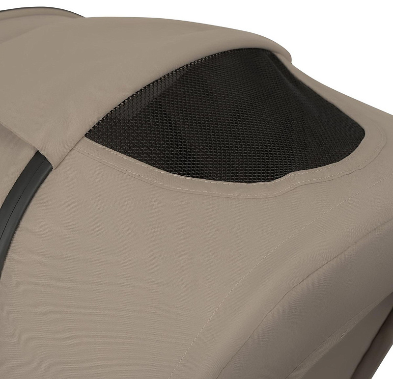 Капюшон коляски регулируется по высоте в пяти положениях и имеет дополнительную секцию на молнии, съемный козырек и смотровое окошко с москитной сеткой. Утепленные боковины и накидка на ножки обеспечивают малышу комфорт в прохладную погоду. Все молнии выполнены с прорезиненным покрытием, главным преимуществом которого является герметичность, долговечность и износостойкость.