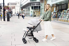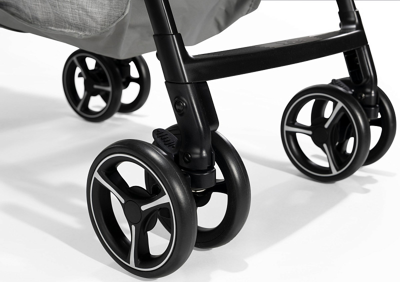 Коляска оснащена четырьмя парными колесами, которые вращаются на 360 градусов, что обеспечивает высокую маневренность и позволяет легко управлять коляской в любом направлении. Коляска имеет амортизацию всех колес, что обеспечивает плавный ход и комфорт ребенку во время прогулок.