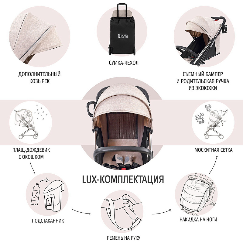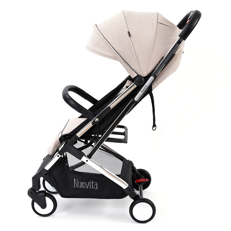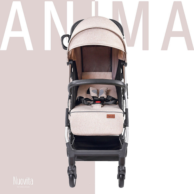 Легкая демисезонная прогулочная коляска Nuovita Anima.Подойдет для путешествий на самолете, поезде и повседневных прогулок, в том числе и в зимний сезон, поскольку сидение коляски способно вместить малыша, одетого в теплый комбинезон. Коляска легко и беспрепятственно проходит в любой лифт. Многопозиционная спинка способна откидываться из положения 115 градусов до уровня 165 градусов и в разложенном виде образует спальное место размером 77х31 см. Веерная подножка предполагает использование 3-х положений. Для того, чтобы ребенок не смог выскользнуть из коляски, в сиденье встроены пятиточечные ремни безопасности с мягкими накладками. Предусмотрен защитный откидной бампер с отделкой из экокожи, за который может держаться малыш. Родительская ручка также защищена накладкой из экокожи.