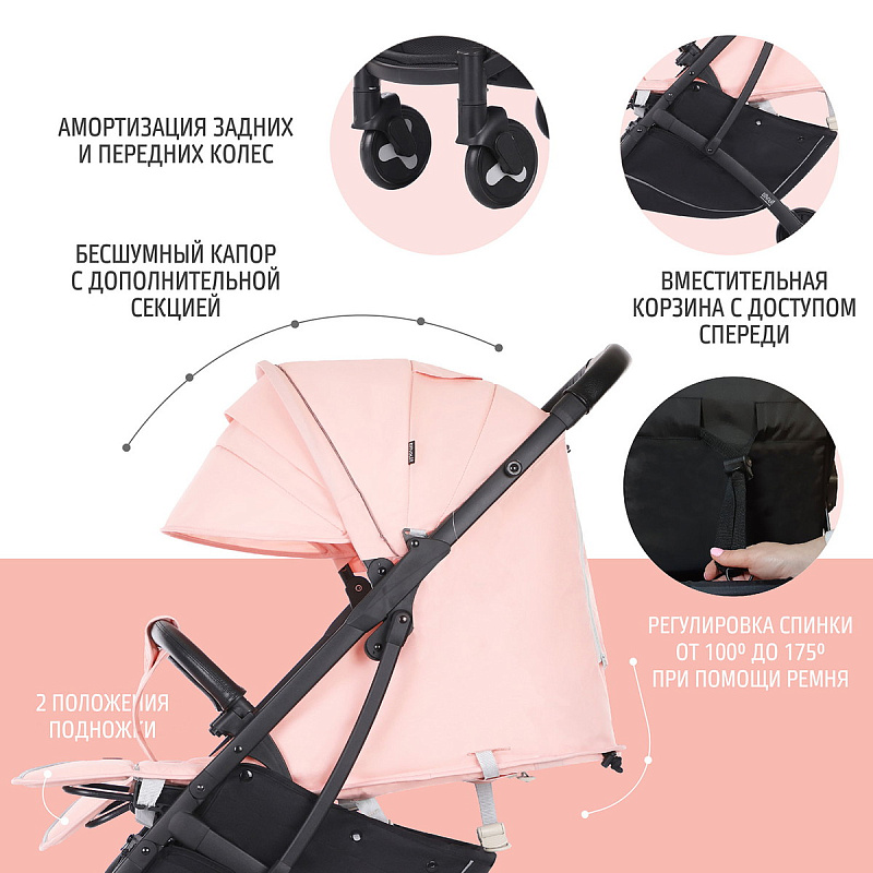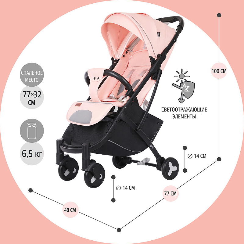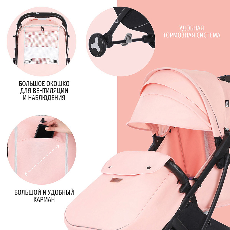 Коляска прекрасно подойдет для путешествий на самолете, поезде и повседневных прогулок, в том числе и в зимний сезон, поскольку сидение коляски способно вместить малыша, одетого в теплый комбинезон. Коляска легко и беспрепятственно проходит в любой лифт. Рама складывается по типу «книжки», изготовлена из прочного алюминиевого сплава, который устойчив к коррозии и деформациям. Небольшие одинарные колеса имеют покрышки из вспененной резины, обеспечивающей мягкость хода. Присутствует амортизация передних и задних колес. Материал обивки — 300D лен — это крепкая, плотная ткань с красивым выразительным плетением. Она имеет специальную обработку, которая делает ткань ветронепроницаемой и защищает ее от намокания и УФ-лучей.